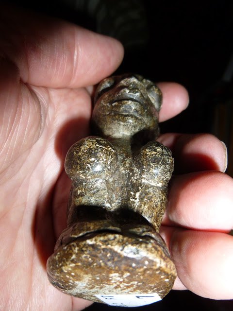 A very small Nomoli carrying a skull, not unlike the right hand Ikenga altars from Nigeria.